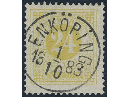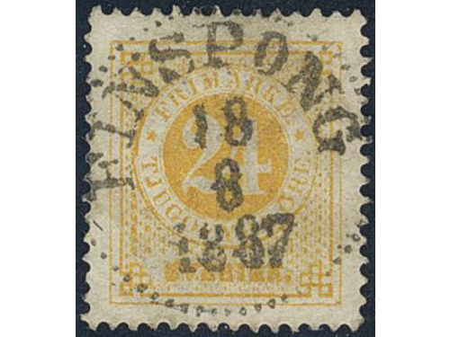 Sweden. Facit 34k used, 24 öre yellow on calendered paper. EXCELLENT cancellation FINSPONG 18.8.1887. Small owner mark on the reverse.