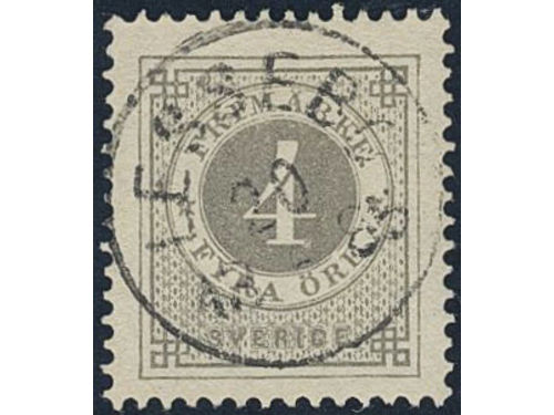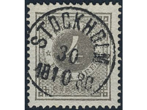 Sweden. Facit 29a1 used, 4 öre dark grey. EXCELLENT cancellation STOCKHOLM 30.10.1880. One slightly short perf.