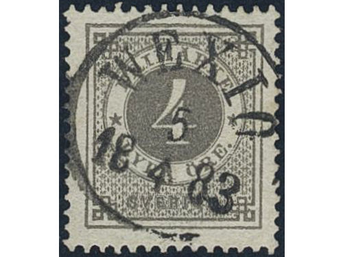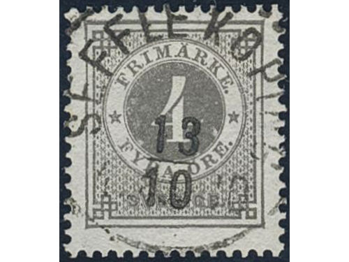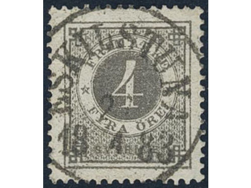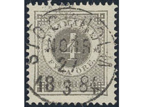 Sweden. Facit 29d used, 4 öre deep grey-grey. EXCELLENT cancellation STOCKHOLM NORR 27.3.1884.