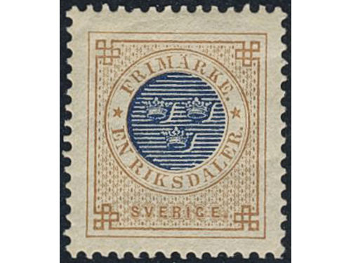 Sweden. Facit 37 used, 1 Riksdaler brown/blue. Beautiful example cancelled ULRICEHAMN 6.10.1878, with small part of a second mark. SEK 4000