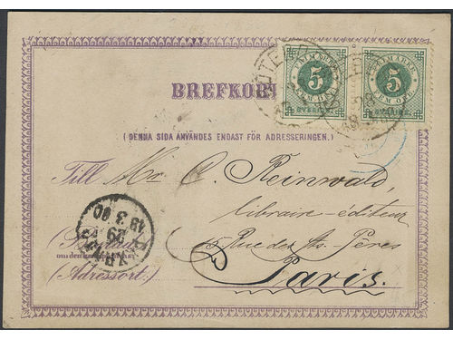 Sweden. Facit 30 on cover, 2×5 öre on early postcard sent from GÖTEBORG 28.3.1880 to France. Weak crease. Privately manu..