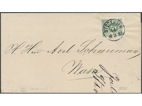 Sweden. Facit 30 on cover, 5 öre on beautiful printed matter sent from STOCKHOLM 14.3.1883, via Russia with transit pmk on the reverse, to Finland. Show less