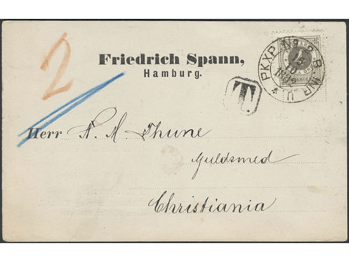 Sweden. Facit 29 on cover, 4 öre on printed matter card printed in Hamburg, sent insufficiently prepaid from PKXP Nr 2 B INR U 15.10.1882 to Norway. Postage due notation '2' (øre). Superb. Show less