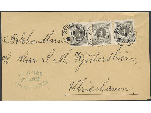 Sweden. Facit 29c1 on cover, 4 öre dark grey on white paper in strip of three. Cover sent from STOCKHOLM 18.8.1882 to Ulricehamn. Certificate HOW 3 (2,3,3) (3,4,4) 4 (1999). Show less