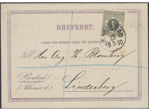 Sweden. Facit 29 on cover, 4 öre on early privately printed postcard, sent as printed matter from KARLSTAD 29.5.1880 to Lindesberg. Decorative item.
