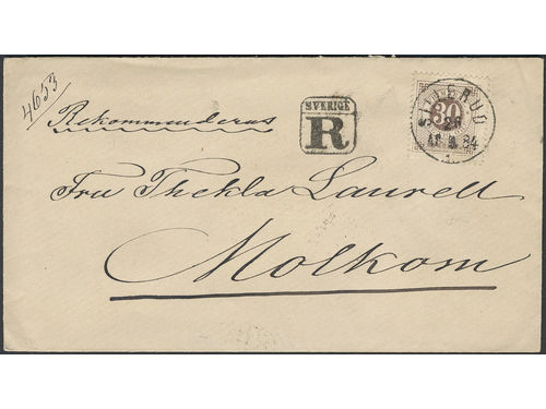 Sweden. Facit 35 on cover, 30 öre on very beautiful registered cover sent from SILLERUD 26.5.1884 via GILLBERGA 27.5.1884 to Molkom. Superb.
