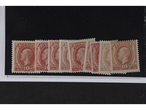 Sweden. Facit 39, 45 ★★/★, 1885 Oscar II 10 öre. F 39 x 2, F45 x 7. One copy F39 * with interesting white spot near the eye. SEK 8500