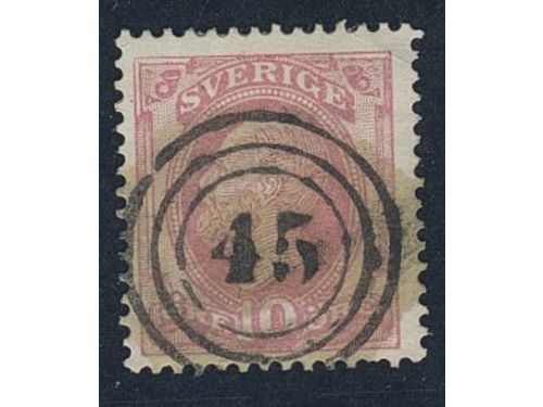 Sweden. Facit 45 used, 1886 Oscar II with posthorn on back 10 öre red. Superb Norwegian numeral mark 45 (Strömstad–Halden). One short perf.
