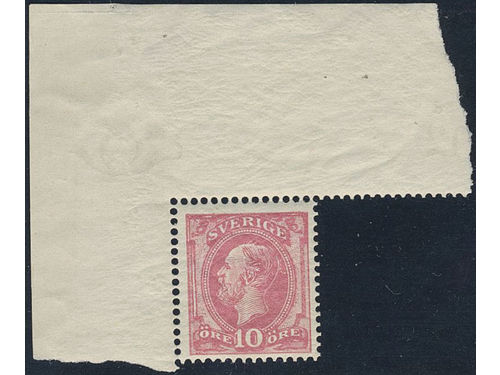 Sweden. Facit 45 ★★, 10 öre Oscar II letterpress with blue posthorn on reverse with corner sheet margin, with margin posthorn and part of control number. SEK 2200+ Show less