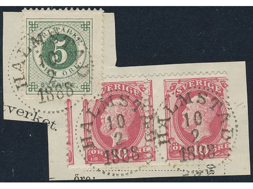 Sweden. Facit 45v6, 43 on piece, 10 öre Oscar II pair with displaced perforation HALMSTAD 10.2.1888 on pice from money order. Show less