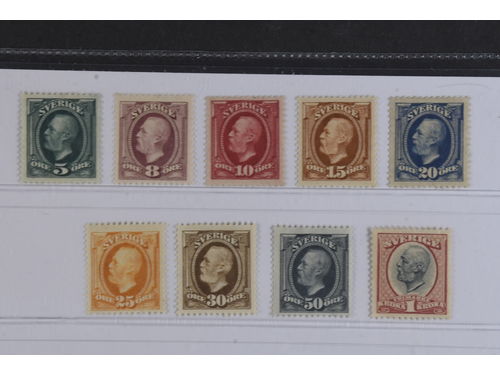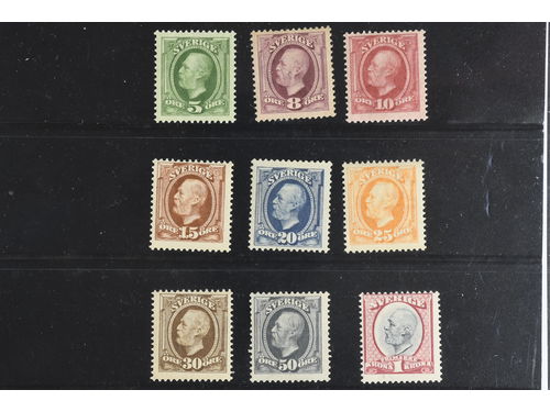 Sweden. Facit 52–60 ★★, 1891 Oscar II SET watermark crown (9). 5 öre *, the others **. SEK 11305 Show less