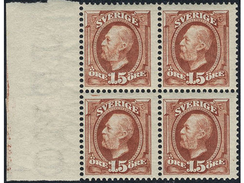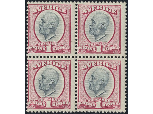 Sweden. Facit 60b ★★, 1901 Oscar II 1 Kr carmine/grey in very fresh block of four. One example with minimal stain in the gum. SEK ca. 15000 Show less