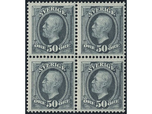 Sweden. Facit 59d ★★, 1904 Oscar II 50 öre olive-grey in a very nice block of four. SEK 10800