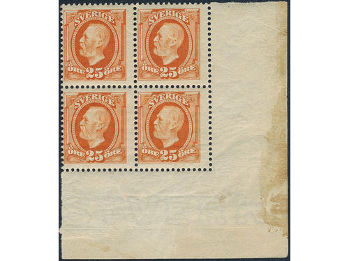 Sweden. Facit 57vm1 ★★, 1896 Oscar II 25 öre orange, inverted wmk. BLOCK of four. Show less
