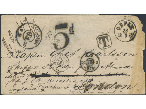 Sweden. Foreign-related cover. Great Britain. Unpaid cover sent from GEFLE 28.9.1878 to 'A A Carlsson, Skeppet Hilda frå.. Read more Sweden. Foreign-related cover. Great Britain. Unpaid cover sent from GEFLE 28.9.1878 to 'A A Carlsson, Skeppet Hilda från Åland'. Postage due mark 5d. Somewhat carelessly opened with upper back flap missing. Show less