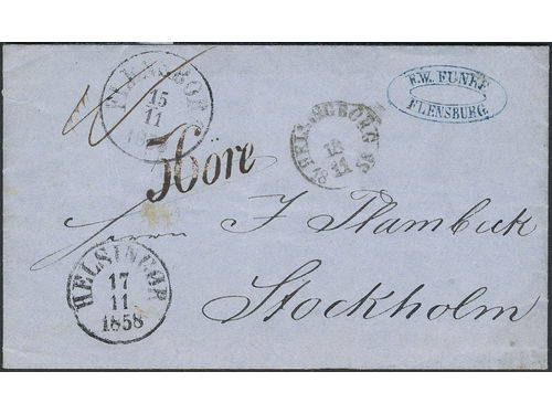 Sweden. Foreign-related cover. Schleswig. Postage due mark 36 öre on letter sent from FLENSBURG 15.11.1858 via HELSINGØR.. Read more Sweden. Foreign-related cover. Schleswig. Postage due mark 36 öre on letter sent from FLENSBURG 15.11.1858 via HELSINGØR 17.11.1858 and HELSINGBORG 18.11.1858. Show less