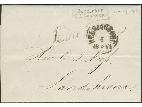Sweden. Foreign-related cover. Denmark. Unpaid cover sent from 'Köpenhamn 5 mars' via HELSINGBORG 6.3.1864 with cancel Å.. Read more Sweden. Foreign-related cover. Denmark. Unpaid cover sent from 'Köpenhamn 5 mars' via HELSINGBORG 6.3.1864 with cancel ÅMGB. BREF FR. DANMARK (P: 6000) and postage due mark 18 öre. Show less