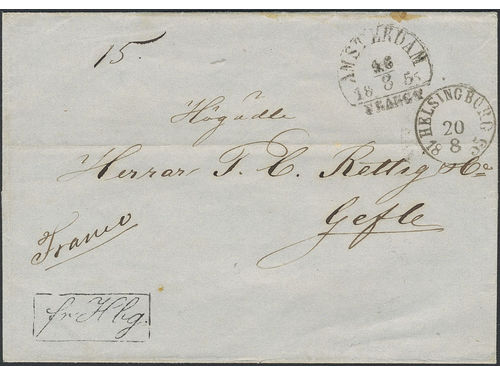 Sweden. Foreign-related cover. Netherlands. Cover sent from AMSTERDAM 16.8.1855 via KS&NPA HAMBURG 18.8.1855 and HELSINGBORG 20.8.1855 to Gävle. Sweden. Foreign-related cover. Netherlands. Cover sent from AMSTERDAM 16.8.1855 via KS&NPA HAMBURG 18.8.1855 and HELSINGBORG 20.8.1855 to Gävle. Show less