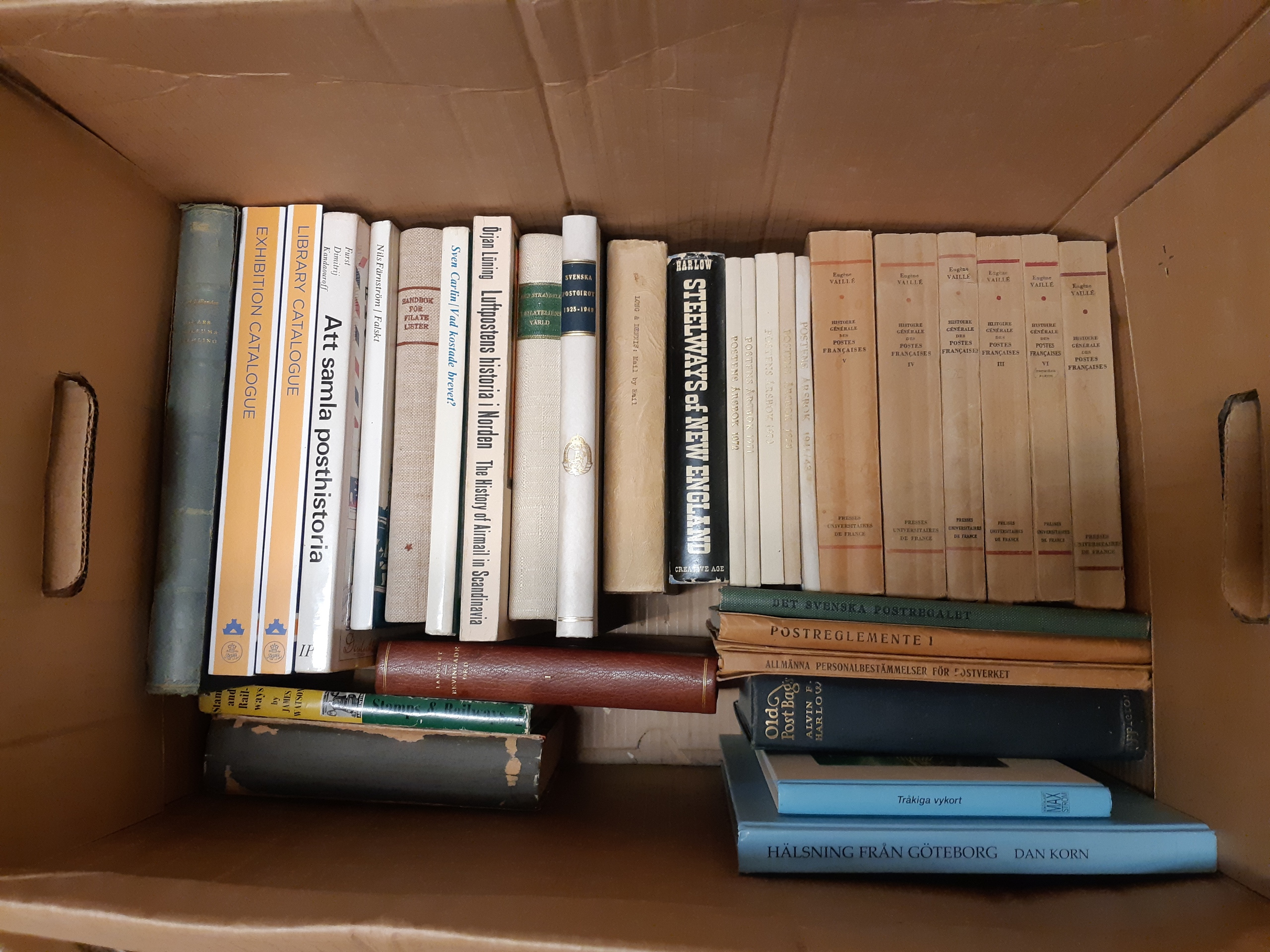 Literature. All world incl. much Sweden. E.g. Vaillé – Postes Françaises, Lüning – Luftpostens Historia i Norden, Rudbeck – Fartyg och Sjöpostförbindelser, Grape – Svensk Posthistoria, Postens Årsbok, Lexicon der Philatelie and much other. In total 52 volumes. Must be picked up. Approx. 31 kg.