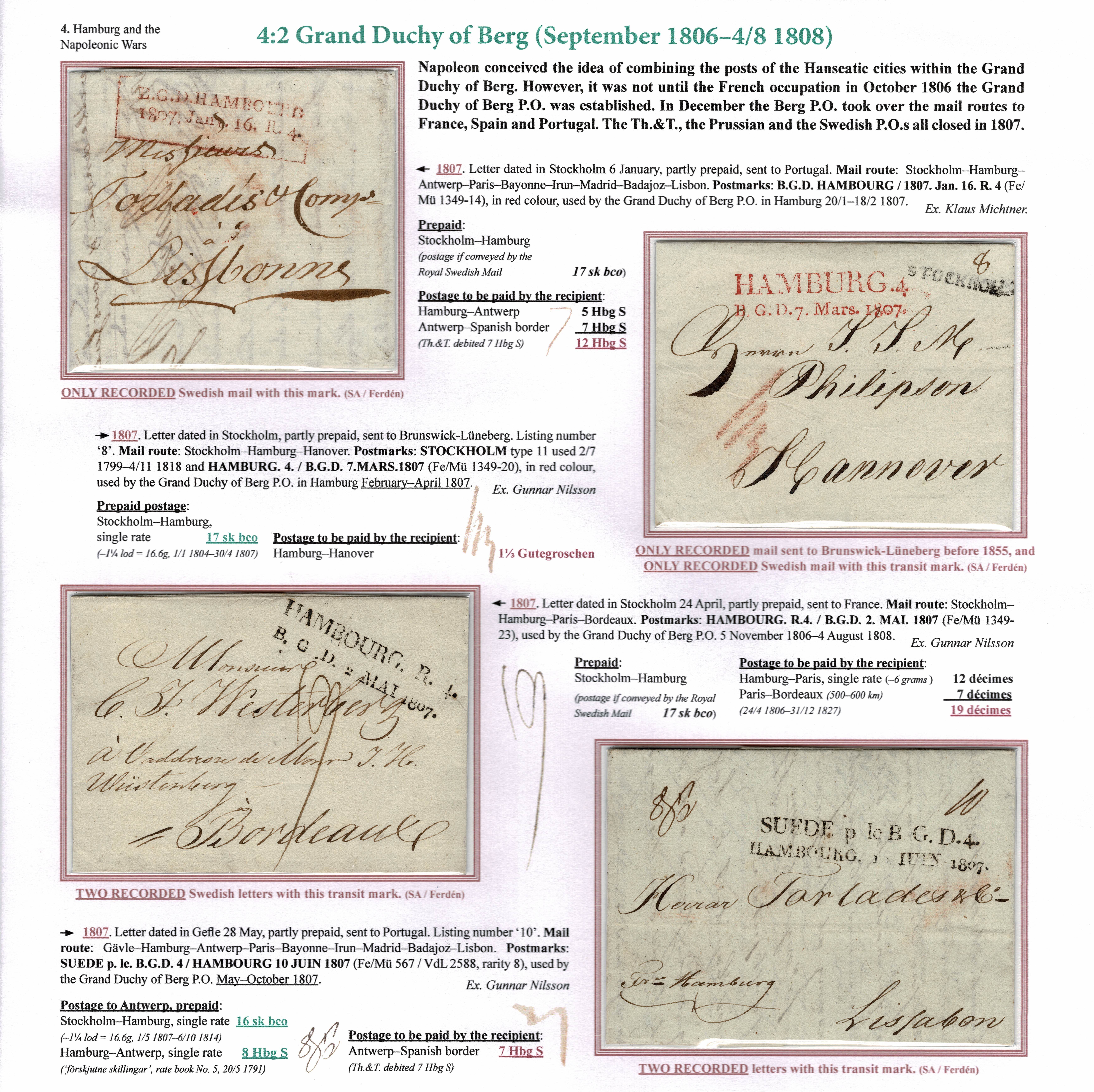 • Only recorded Swedish mails with pmk HAMBURG. 4 / B.G.D (Date), and B.G.D HAMBOURG / (Date) R. 4, respectively (1807)