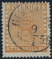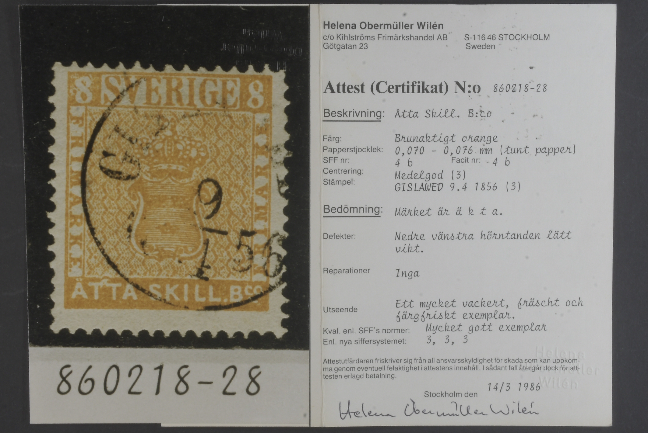 Sweden. Facit 4b used, 8 skill brownish orange. Very fine example cancelled GISLAWED 9.4.1856. Certificate HOW 3, 3, 3 (1986). SEK 6500