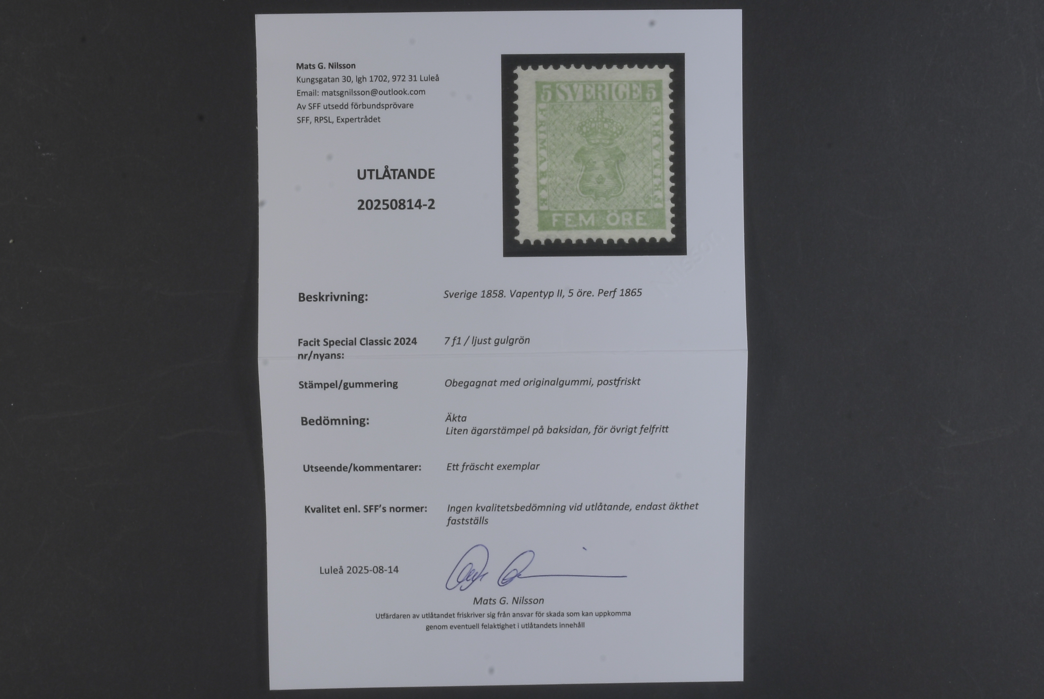 Sweden. Facit 7f1 ★★, 5 öre light yellow-green, perforation of 1865. Fresh MNH example. Small owner mark on reverse. Opinion by Mats Nilsson (2025). SEK 5000