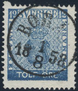 Sweden. Facit 9a1 used, 12 öre greenish dark blue with one double perf. Superb cancellation BORÅS 1.8.1858. Allegedly, position 98.