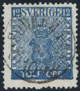 Sweden. Facit 9a2 used, 12 öre greenish blue with double perf. Superb cancellation SÖDERHAMN 2.10.1858. Allegedly position 100.
