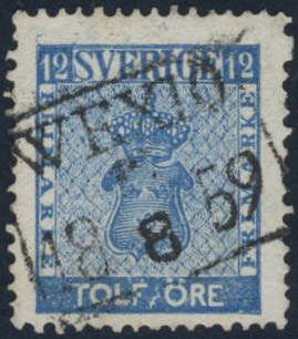 Sweden. Facit 9c1 used, 12 öre blue with one double perf. Superb cancellation WEXIÖ 17.8.1859. Allegedly, position 8.