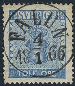 Sweden. Facit 9c3 used, 12 öre blue, perforation of 1865. Excellent canc. FALUN 4.1.1866. SEK 18