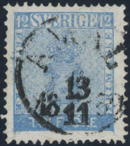 Sweden. Facit 9d1 used, 12 öre light blue. Superb cancellation ÅMÅL 13.11.1859. Allegedly position 93.