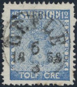 Sweden. Facit 9d1 used, 12 öre light blue. Superb cancellation GEFLE 6.3.1859. Allegedly, position 46. Small, light ink lines on reverse.