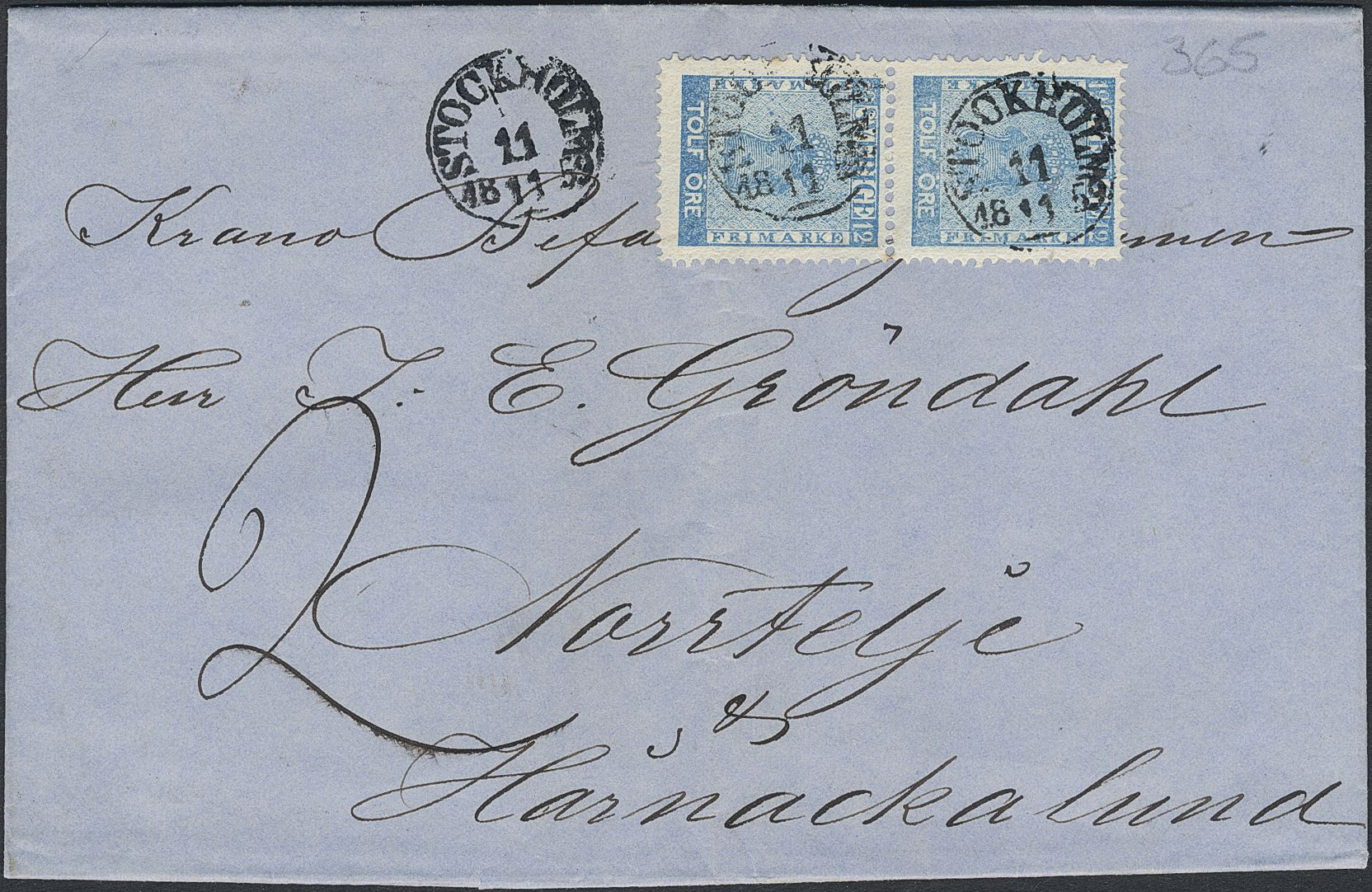 Sweden. Facit 9d1 on cover, 2×12 öre light blue (pair) on beautiful 2-fold cover sent from STOCKHOLM 11.11.1859 to Norrtelje. Weak crease through one stamp.