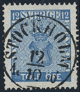 Sweden. Facit 9d2 used, 12 öre light blue. Superb cancellation STOCKHOLM 12.10.1866. Allegedly, position 77 plate 5.