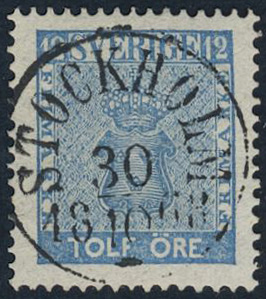 Sweden. Facit 9d3 used, 12 öre light blue, perforation of 1865. EXCELLENT example STOCKHOLM 30.10.1868.