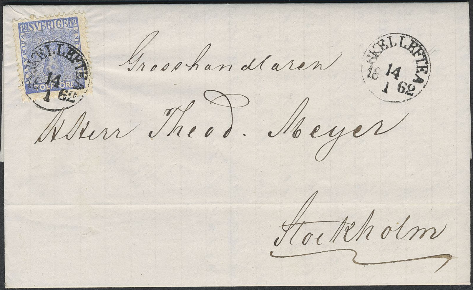 Sweden. Facit 9h1 on cover, 12 öre bright ultramarine. Vey beautiful cover sent from SKELLEFTEÅ 14.1.1862 to Stockholm.