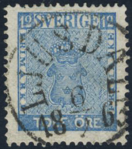 Sweden. Facit 9l used, 12 öre blue, dense background. Superb cancellation LJUSDAL 6.7.1863. Allegedly position 84 plate 4.