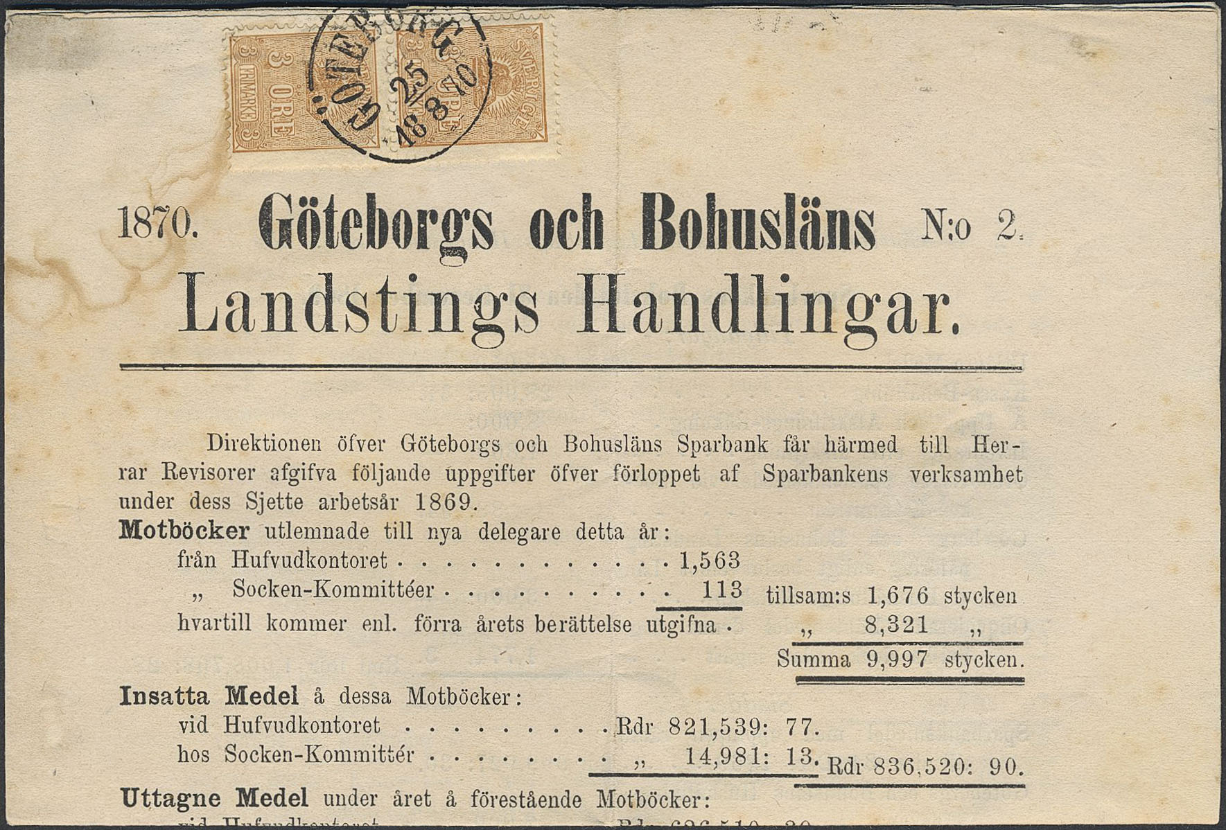 Sweden. Facit 14B on cover, 2×3 öre (pair) on printed matter, 'Göteborgs och Bohusläns Landstings Handlingar No. 2 1870' (cpl.). Slightly moisture affected. SEK 300
