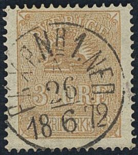 Sweden. Facit 14Bd used, 3 öre orange-brown, type II. EXCELLENT cancellation PKXP NR 1 NED 26.6.1872.