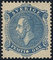 Sweden. Facit 16, 99 (★), C A Nymans proposal stamp FEMTO öre in blue colour with dashed background. With partly filled 'O' variety.