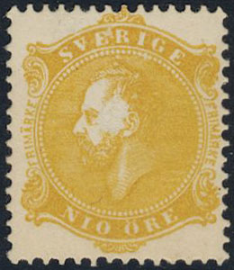 Sweden. Facit 16, 99 (★), C A Nymans proposal stamp NIO öre in brown yellow colour with dashed background. Scraping on front.