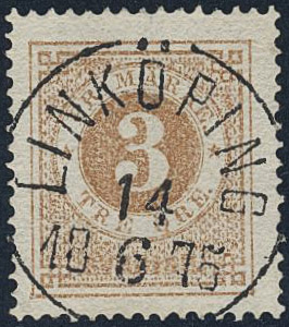 Sweden. Facit 17g used, 3 öre dull orange-brown. Superb cancellation LINKÖPING 14.6.1875. Signed by O.P.