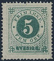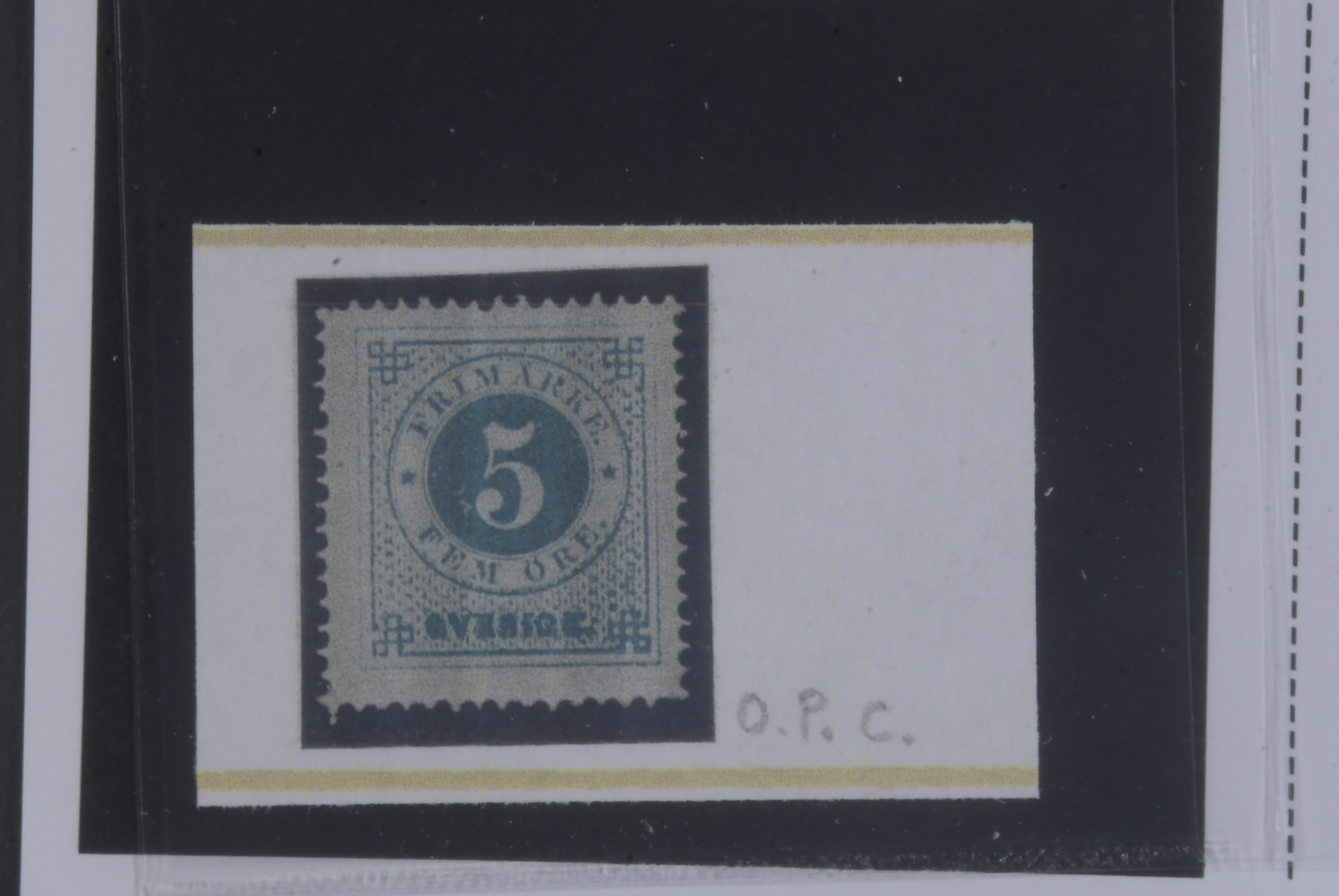 Sweden. Facit 19c (★), 5 öre emerald green. Regummed, bent corner perf, still beautiful. Opinion (shade) by O.P. SEK 4000