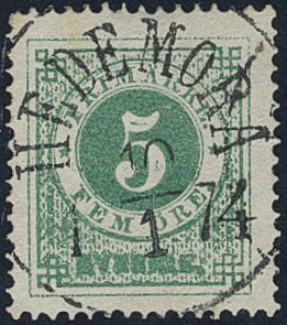 Sweden. Facit 19c used, 5 öre emerald green. EXCELLENT cancellation HEDEMORA 10.1.1874, with small part of a second pmk.