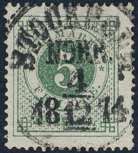 Sweden. Facit 19f used, 5 öre dark green, grainy print. EXCELLENT cancellation STOCKHOLM NORR 4.12.1874. Signed by O.P.