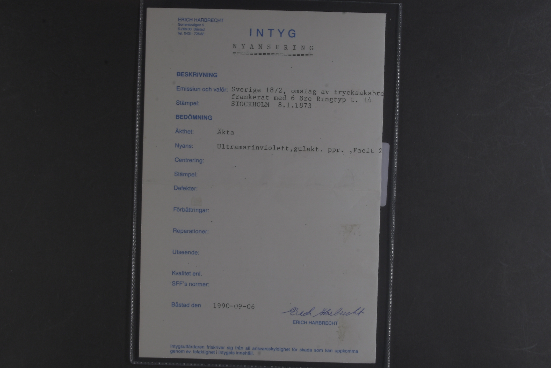 Sweden. Facit 20b on cover, 6 öre ultramarine-violet on yellowish paper. Printed matter sent from STOCKHOLM 8.1.1873 to Norrtelje. The cover with small paper damage, still beautiful. Opinion (shade) by Erich Harbrecht (1990).