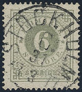 Sweden. Facit 20f used, 6 öre brownish olive-grey. Superb cancellation STOCKHOLM C 31.3.1877. One weakly bent corner perf. Scrace shade.