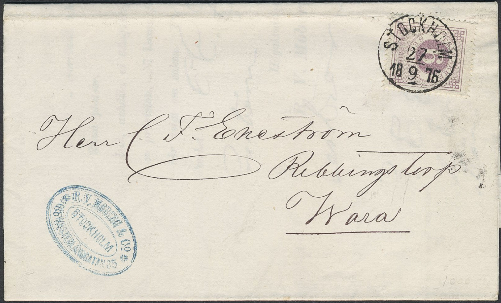 Sweden. Facit 20j on cover, 6 öre lilac. Beautiful printed matter sent from STOCKHOLM 27.9.1875 to Vara.