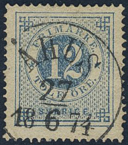 Sweden. Facit 21j used, 12 öre pale blue. Beautiful example cancelled ÅHUS 27.6.1874. Bent corner perfs.