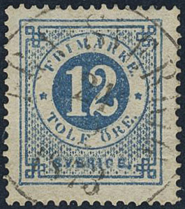 Sweden. Facit 21k used, 12 öre blue-light blue. Superb cancellation FRA SVERRIG 21.2.1873.